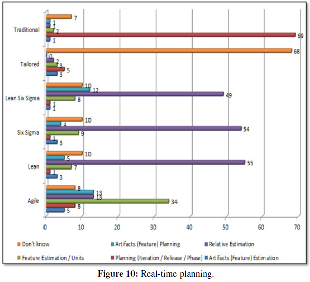 Real-time planning enables full planning integration with the project or program execution. Governance planning process is responsible for supervision of operational plans being implemented and methods of their delivery. The majority of responses, as shown in Figure 10, indicate that the traditional planning process is still predominant (69 or 85% respondents), but it is obvious that the lightweight agile planning practices are emerging: relative estimation, feature estimation/units, and artifacts planning and estimation.