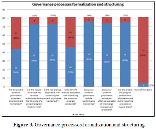 Conversely, responses to the question whether the governance processes are formalized and structured exposed only 54%of consent. This indicates that organizations are still behind the required level of project portfolio governance formalization and structure.
