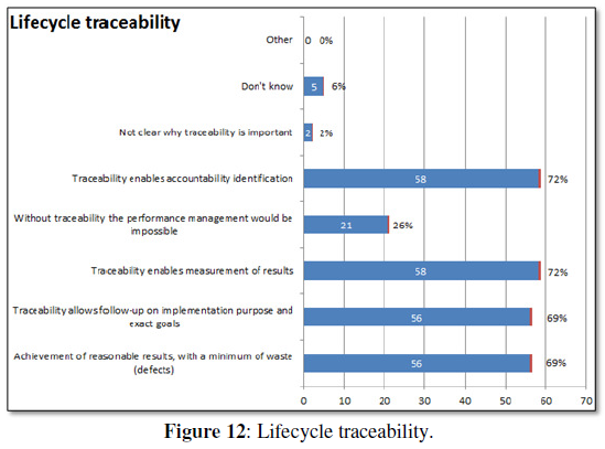Survey results indicate that the accountability identification (72%) and enabling measurement of results (72%) are predominant factors that should be supported by agile methodology in order to properly identify and align accountability for the plans that are fully integrated with project/program execution, followed by implementation purpose and exact goals (69%) and achievement of reasonable results with minimum waste (69%). Figure 12 shows the lifecycle traceability responses.