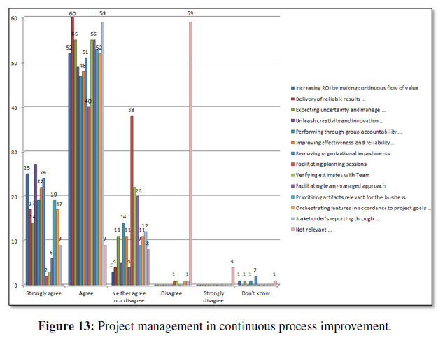 Survey results indicate the importance of the role of agile project management in continuous process improvement and values delivery: for majority of respondents’ delivery of reliable results by engaging customers in frequent interaction and shared ownership (74%) and stakeholder's reporting through tangible progress in achieving manageable piece of functionality (73%) are the most important project management values.