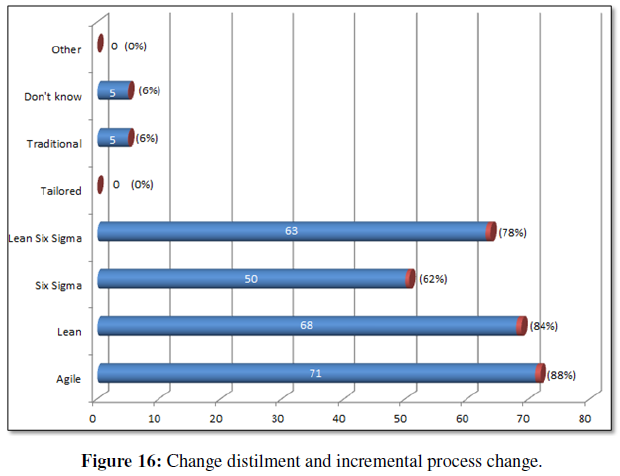 Responses indicate that the lightweight methodologies support continuous improvement efforts and incremental process changes: agile methods the most (88% of respondents), Lean (84%), Lean Six Sigma (78%), and Six Sigma (62%), as shown in Figure 16.