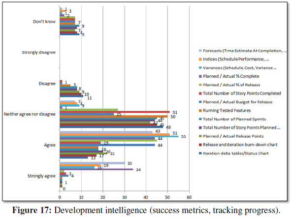Survey results indicated that respondents strived to a certain extent with regard to addressing the performance metrics and project or program progress tracking. Results confirmed that the traditional EVM measures: variances - schedule, cost, variance at completion (68% responses), indices - schedule performance, cost performance, to-complete performance (63%), status measures - planned / actual % complete (54% agree; 42% strongly agree), and forecasts - time estimate at completion, estimate to complete (53% agree; 37% strongly agree), are predominately considered as performance metrics and development intelligence, as shown in Figure 17.