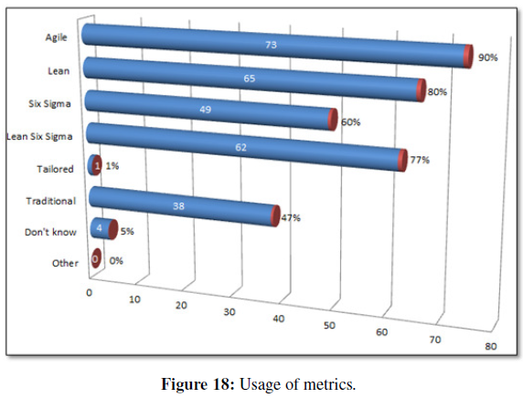 Respondents recognized that predominately lightweight and agile methods use metrics thus providing information to the governing body on their critical performance: 90% agile, 80% Lean, 77% Lean Six Sigma, 60% Six Sigma. Less than half of respondents (47%) indicated that the traditional methods provide sufficient information to the governing body on project / program critical performance. Thus, the key strength of the traditional project management is its tracking metrics toolkit (e.g., Gant charts, work breakdown structure, issue and risk logs), and performance reporting capabilities (e.g., overall status reporting – scope/schedule/cost/quality, or status dashboards with embedded indicators in order to simplify the tracking of projects or programs). (Figure 18)