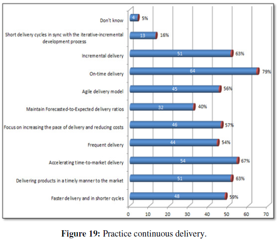 Survey results indicate that on-time delivery (79% responds) is the most important continuous delivery practice for review of the agile project/program performance, followed by accelerating time-to-market delivery (67%), delivering products in a timely manner to the market (63%), incremental delivery (63%),
