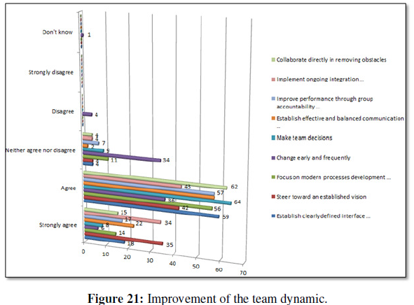 Survey results indicated factors that contribute the most to the improvement of team dynamic, as shown in Figure 21: make team decisions (79% respondents), followed by direct collaboration in removing organizational and technical obstacles (77%), establishing clearly defined interface between the project team and the executives (73%), improving performance through group accountability for results and shared responsibility for team effectiveness (70%) and focusing on modern processes development and their management (69%).