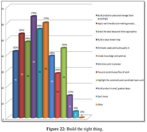 Factors that contribute to a product or service delivery to converge on an optimal customer solution are, based on the survey results, predominately characteristics of the lightweight methodologies: build a value stream map (79% responses), create knowledge and optimize (74%), eliminate waste and build quality in (69%), apply real-time decision-making process based on actual events and information (65%), select the best ideas and refine approaches (59%), and highlight the constraints and coordinate team work (54%).