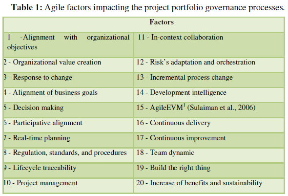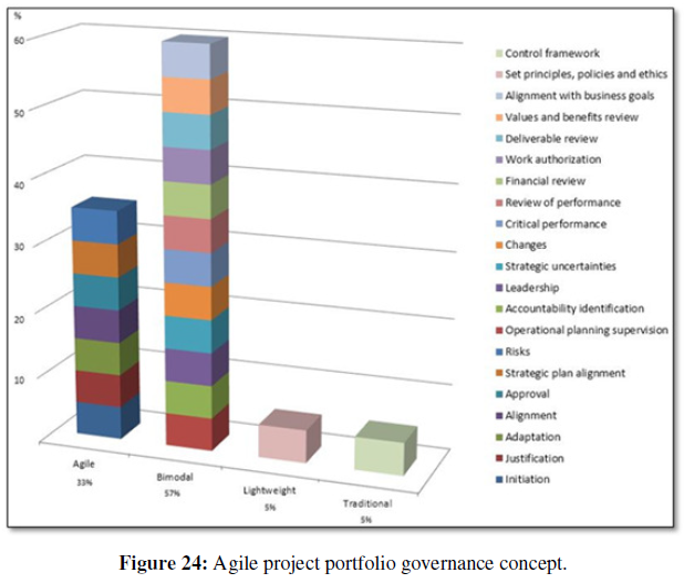 The results enlist the agile and lightweight factors with the most significant impact on the project portfolio governance processes, and consequently, what are predominant methods in structuring of these processes. The findings also expose the construct of the agile project portfolio governance framework, showing that agile, lightweight, and hybrid (bimodal) agile/lightweight methodologies are predominant in structuring of the governance frameworks and its processes.