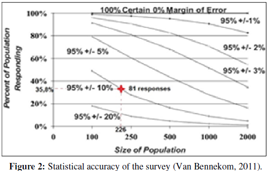 The size of the population for the survey, 226 respondents, was the sample because the request for answer was sent to all 226 respondents. The response rate was 35,8% (81 respondents completed the survey). The chart in Figure 2 shows curves depicting levels of accuracy, starting from the first one at the top representing 100% certainty and 100% accuracy. This chart employs the most conservative assumption about degree of variance in responses from the population.