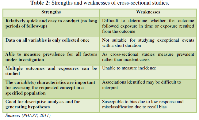 For the purpose of this observational research, the most suitable survey design is cross-sectional design or cross-sectional analysis, involving the analysis of data collected from a representative subset at one specific point in time. The strengths and weaknesses of the cross-sectional studies are shown in below Table 2 (PHAST, 2011):