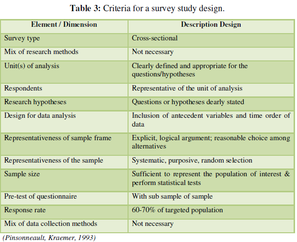Since the results of the survey are collected at one point in time, the results can be generalized. The survey design criteria that must be met are presented in Table 3 (Pinsonneault, Kraemer, 1993):