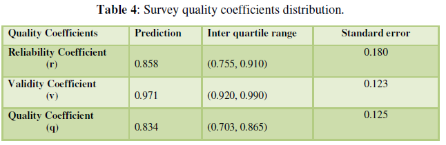 For testing the quality of questions, several survey questions were analyzed. Survey prediction overview is presented in below enclosed tables. Table 4 shows the statistical dispersion of survey quality coefficients with their prediction, inter quartile range (IQR), and standard error. The quality coefficients are the square root of the quality indicators. These are the coefficients that are estimated in the simulation. The uncertainty exists in the estimates presented in the inter quartile range and the standard error.