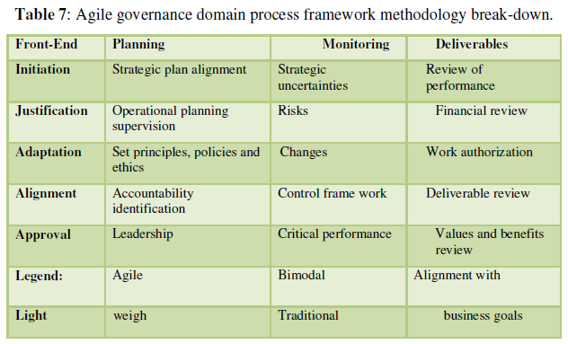 The following agile and lightweight methodologies constitute the agile project portfolio governance domain processes and the agile governance framework, as shown in Table 7: